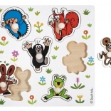 Ez a KISVAKOND motívumos fa bedugós puzzle szórakoztató és fejlesztő játékot kínál a gyerekeknek. Minden figura saját gombos fogantyúval rendelkezik, így az elemeket könnyű felemelni, áthelyezni és a tábla körvonalaiba illeszteni. A gyerekek így természetesen gyakorolják a mozdulatok pontosságát és a türelmet.