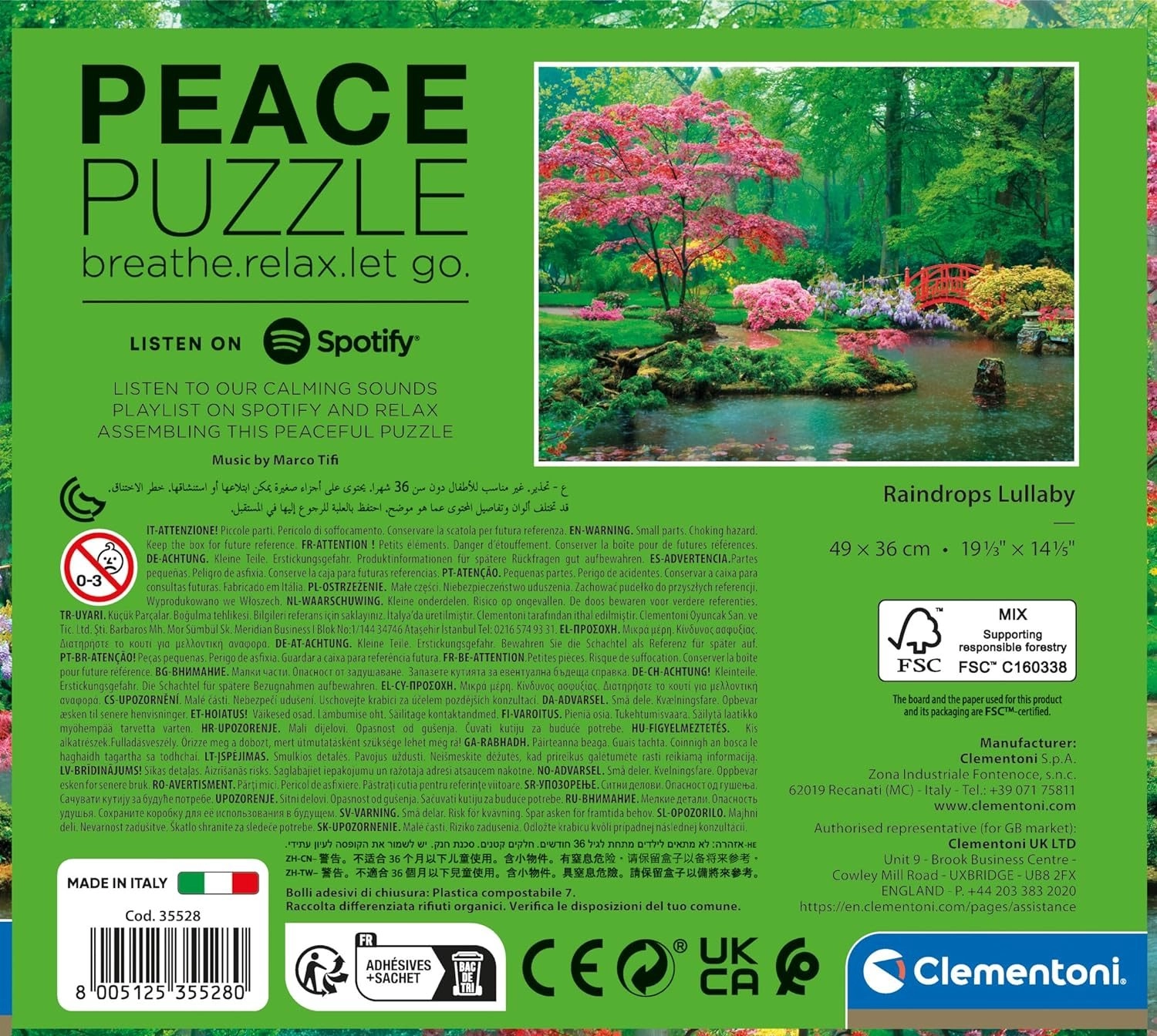 A dobozban nemcsak a mintát ábrázoló posztert találja a kényelmesebb kirakáshoz, hanem tippeket is a megnyugváshoz és a belső egyensúly eléréséhez, továbbá QR/hivatkozást egy relaxációs zenékkel és hangokkal teli Spotify-lejátszási listához. Ideális ajándék puzzle-rajongóknak és mindenkinek, aki egy kis nyugalomra vágyik.