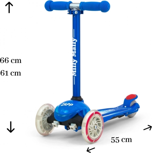 A Zapp Milly Mally gyermek roller a gyerekek igényei szerint készült. Az alumínium, kivehető kormánynak köszönhetően rendkívül könnyű. A csúszásmentes markolatok védőkupakokkal óvják a kis utazó kezeit, a speciális csúszásgátló bevonattal ellátott fellépő pedig jobb tapadást biztosít. Ezeknek a funkcióknak köszönhetően a gyermek helyesen és gyorsan fejlődik, miközben rengeteg szórakozásban lesz része.