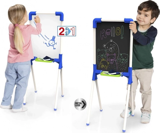 Kiváló gyerek kétoldalas tábla 2 az 1-ben fehér felülettel a törölhető filcekhez és fekete felülettel a hagyományos krétákhoz. Ideális a gyerekek kreativitásának fejlesztésére.