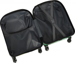 A belső tér két részre osztott – az egyik hálós zsebbel, a másik keresztpántokkal a tartalom biztonságos rögzítéséhez. A négy forgó kerék és a kihúzható fogantyú lehetővé teszi, hogy a gyerekek könnyedén vezessék a bőröndöt.