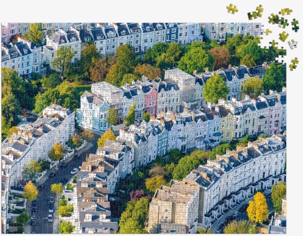 Az utcákra nyíló légifotó Notting Hillről lenyűgöző szín- és részletkompozíciót nyújt, amely öröm a kirakás során, és elkészülve a falon is hatásos.