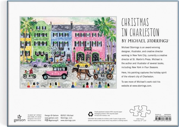 Ismerje meg a charlestoni festői utcák varázsát az ünnepi szezon alatt a Karácsony Charlestonban puzzlével, amelyet Michael Storrings tervezett. Ez a műalkotás nemcsak pihentető lehetőséget nyújt, hanem fejleszti a logikai gondolkodást és a részletekre való érzékenységet is.