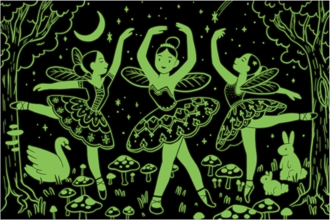 Rakd össze a Swan Lake lenyűgöző táncjelenetét ezzel a sötétben világító puzzléval! 100 darabból áll, elegáns táncosokkal, akik a sötétben tündérekké alakulnak egy varázslatos réten.