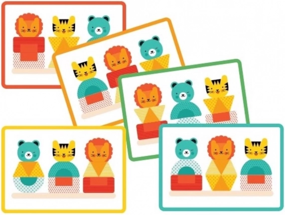 Minden állat geometriai formákból áll, és lehetőséget nyújt a gyermekeknek az útmutatás szerinti vagy saját fantázia szerinti építésre: