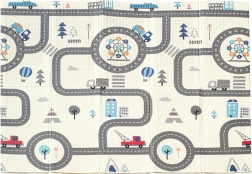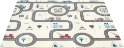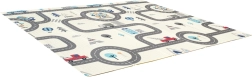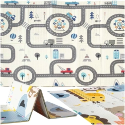- Kétoldali dizájn: egyik oldalon bájos állatok, másikon városképes játszópálya, amely kiváló terep a kisautók számára.
