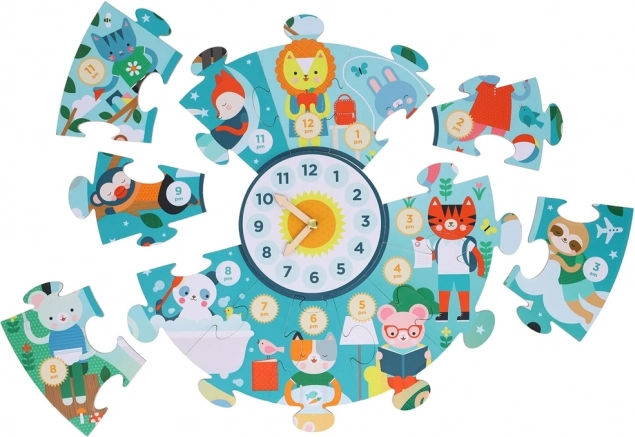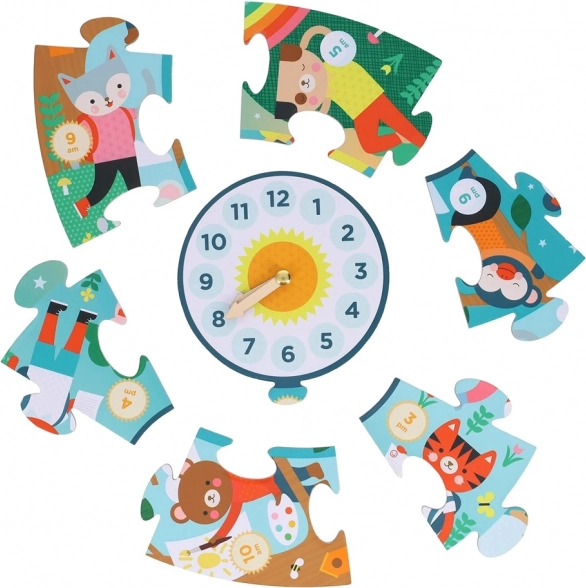 A puzzle közepén egy nagy számlap található állítható mutatókkal. A gyerekek így játékosan gyakorolhatják az órák és percek meghatározását, összekötve a játékot a gyakorlati tanulással.