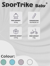 A SporTrike PettyTrike futóbicikli ideális első „kerékpár” körülbelül 1–3 éves gyerekeknek. A négy keréknek és az alacsony felépítésnek köszönhetően kiváló stabilitást nyújt, így a kicsik félelem nélkül a egyensúly és a finommotorika fejlesztésére koncentrálhatnak. A könnyű konstrukció megkönnyíti a kezelhetőséget és a szülők számára a hordozást is.