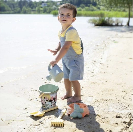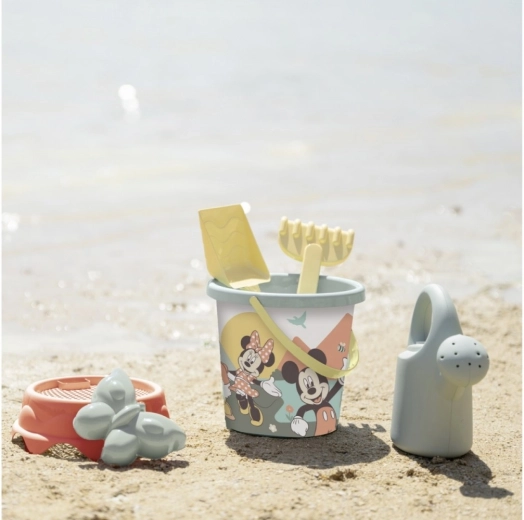 A készletben Mickey egér képével díszített vödör, gereblye, lapát, homokforma és locsolókanna található. Gyártásához újrahasznosított műanyagot használtak. Franciaországban készült.