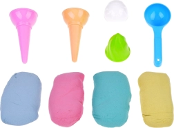 - A csomag tartalma: 4× 70 g homok (sárga, rózsaszín, zöld, kék), 2 műanyag tölcsér, 2 műanyag gombóc, fagyiskanál