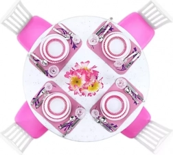 A szett tartalmaz kerek asztalt, 4 széket, kétféle tányért, alátéteket, teljes evőeszközkészletet 4 főre, 8 poharat és dekoratív vázát virágokkal – mindezt elegáns fehér–rózsaszín összeállításban.