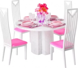 Ez az átgondolt bútorszett hangulatos étkezővé varázsol bármely babaházat. A valósághű részleteknek köszönhetően – a rózsaszín alátétektől a tányérokon és evőeszközökön át a poharakig – a gyerekek hosszú órákon át élvezhetik a fantáziajátékot és a babákkal közös étkezéseket.