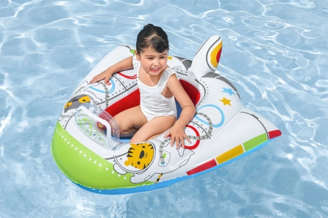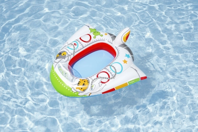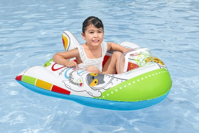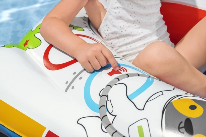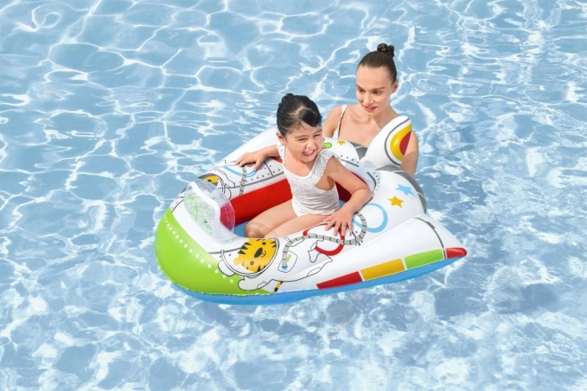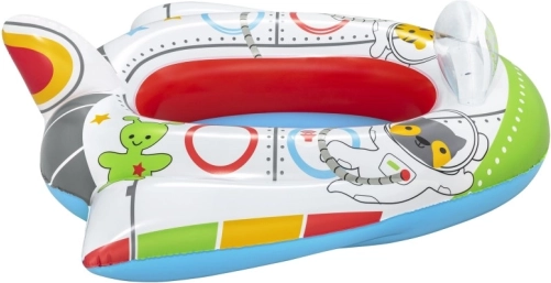 A csónak színes űrbeli karakterekkel díszített, amelyek vonzóak a gyerekek számára.
