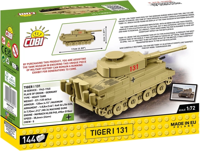 A COBI építőkockákból készült modell a Tiger I 131-es tankot ábrázolja, az egyetlen megőrzött működő példányát a második világháború korszakából. Ez a történelmi kincs, mely a brit The Tank Museum-ben, Bovingtonban látható, valódi csillag a tankok között. A Tiger 131-es 1942-ben készült, a brit erők ejtették foglyul Tunéziában 1943 májusában, és alapos konzerválás után lett a múzeumi kiállítás része.