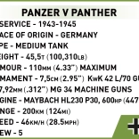 Fedezze fel a Panzer V Panther harckocsi precízen kidolgozott mini modelljét – a második világháború egyik legismertebb gépét. A COBI építőkészlet 1:72 méretarányban hűen adja vissza az eredeti formáját és részleteit, beleértve az oldalak nyomtatott történelmi jelzéseit. A torony finoman forgatható, a lövegcső fel-le mozgatható, így a modellt nemcsak a polcon, hanem játék közben is élvezheti.