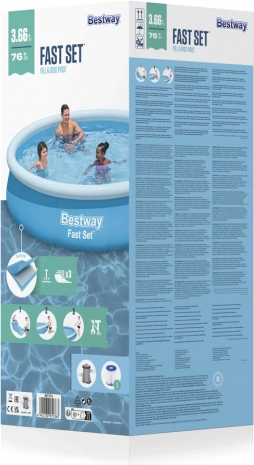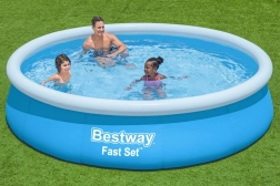 A BESTWAY Fast Set felfújható, föld feletti medence ideális választás a gyors felfrissüléshez a kertben. Az összeszerelés néhány perc alatt elvégezhető – felfújja a felső gyűrűt, megnyitja a vizet, és a falak a vízszinttel együtt maguktól felemelkednek. A masszív, tartós felületkezelésű anyag bírja a mindennapos családi pancsolást.