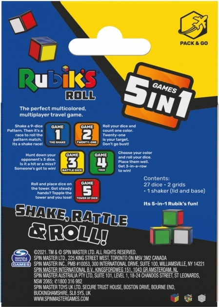 A Rubik Roll hordozható játék, amely 27 kockát, egy rázót és két rácsot tartalmaz. Ez a dinamikus játék öt játékból áll: Rázás, Huszonegy, Kocka csata, Trió és Kocka torony, amelyek különböző készségeket kombinálnak, mint a számolás és stratégiai kockaelhelyezés.