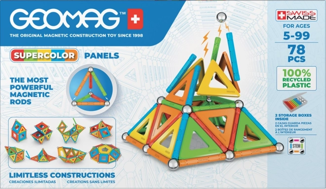 Fedezd fel a kreatív világot a Geomag Supercolor Panels készlettel, amely 100% újrahasznosított műanyagból készült. Ez a 78 darabos mágneses építőjáték erős mágneses kapcsolódást, élénk színeket és változatos formákat kínál a végtelen építési lehetőségekhez. Támogatja a finommotorikát, a térbeli gondolkodást és a kreativitást 5 éves kortól.