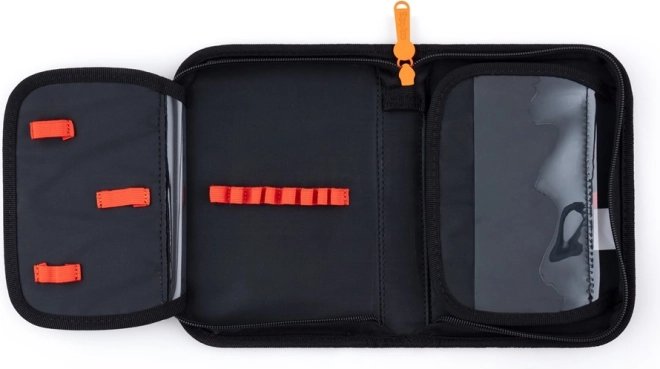 A tolltartó egyszintes, két fülekkel és gumipántokkal az íróeszközök biztos rögzítéséhez. Tartalmaz átlátszó fóliát az órarendhez, amely segít az iskolai kötelezettségek szervezésében.