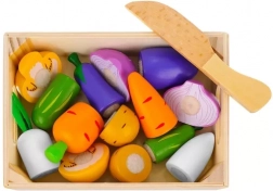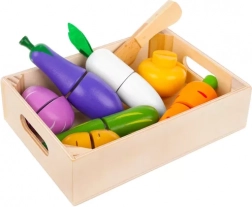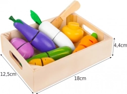 Szórakoztató fa zöldségkészlet vágáshoz stílusos ládában, amely órákig tartó kreatív játékot nyújt a gyerekeknek. A belső tépőzáraknak köszönhetően az egyes darabok könnyen „felvághatók”, majd biztonságos fakéssel újra összekapcsolhatók. Támogatja a finommotorikát, a kreativitást és a színek és formák tanulását, tartós és könnyen hordozható.