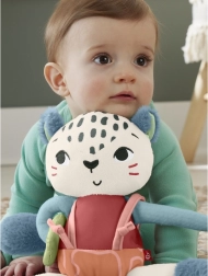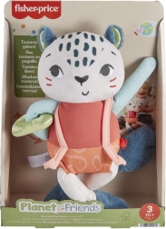 A FISHER-PRICE Planet Friends plüss párduc a legkisebbek kíméletes érzékszervi stimulációjára készült. A kontrasztos minták vonzzák a tekintetet, a puha textúrák és fülecskék a tapintásos felfedezést segítik, a susogó „cipők” pedig nyomkodásra és hallgatásra ösztönöznek. A hosszú lábak, pántok és a csúszó gyűrű motiválják a gyerekeket a megfogásra, húzásra és a finommotorika gyakorlására.