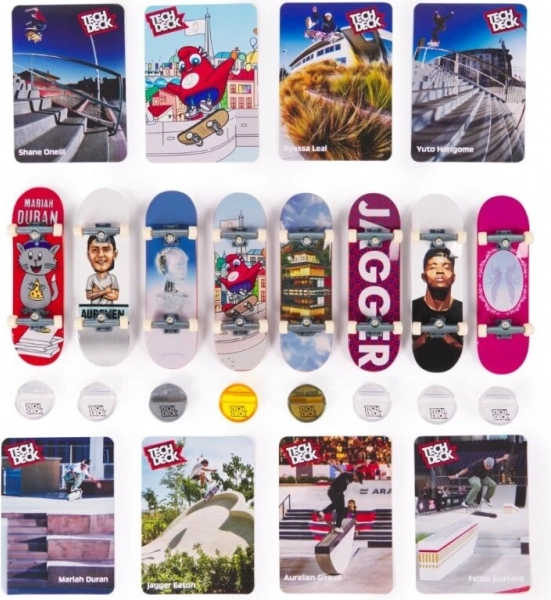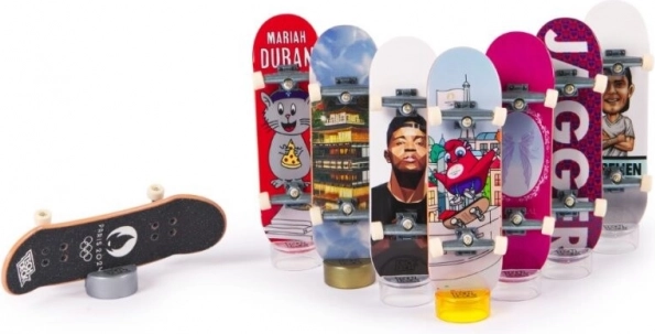 Mindegyik ujjdeszka ebben a kollekcióban autentikus dizájnnal rendelkezik, világszerte ismert gördeszkás cégektől. A csomag tartalmaz továbbá 8 gyűjtőkártyát, amelyeken válogatott gördeszkások akrobatikus trükkjei láthatók. Helyezze az ujjdeszkákat a arany, ezüst és bronz tartóállványokra, és büszkén mutassa meg mesterműveit.