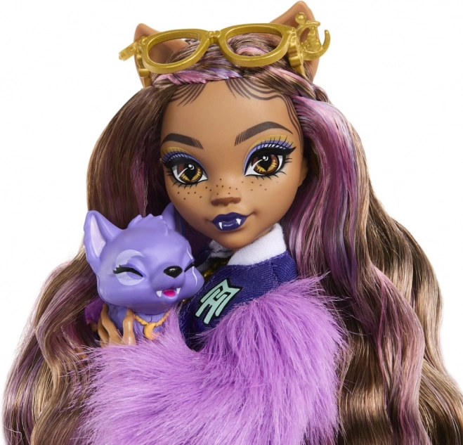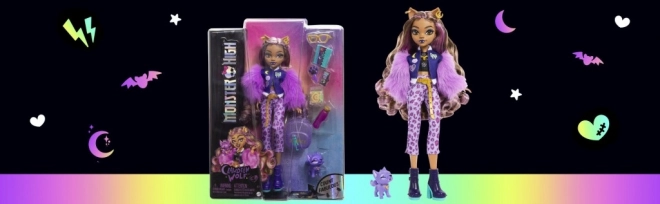 Clawdeen Wolf szőrmés dzsekiben és leopárdmintás nadrágban ragyog, amelyek kiemelik magabiztos stílusát.