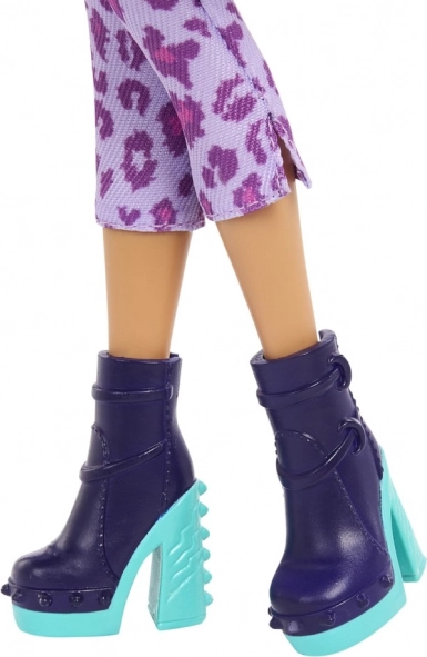 A „karmos” outfitet a lila szőrmés dzseki, a leopárdmintás nadrág, valamint a nyaklánc, az öv és a platform cipők alkotják. A gazdag kiegészítőcsomag – hátizsák, szemüveg, kulacs, nasi és szelet, szervező és a kisállatkefe – támogatja a képzeletbeli játékot és a polcos kiállítást is.
