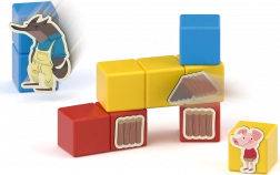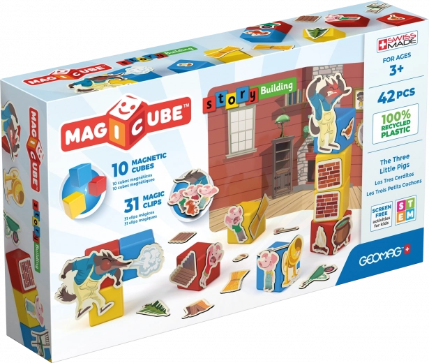 A szett 10 masszív mágneses kockát és 31 illusztrált klipet tartalmaz a kismalacokkal, a farkassal és a házépítéssel kapcsolatos motívumokkal, így a kicsik elmesélhetik a jól ismert történetet vagy újakat találhatnak ki. Az anyagok egészségre ártalmatlanok, és a Geomag márkára jellemző svájci precizitással készültek.