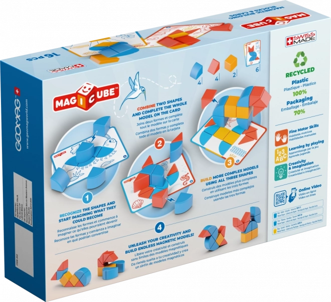 A Geomag Magicube Shapes játékos formában vezeti be a gyerekeket a formák és a szerkezetek világába. Az okos mágneses technológiának köszönhetően az elemek több irányból is vonzzák egymást, így az építés intuitív, szórakoztató és motiváló a további felfedezéshez. A csomagban kétoldalas ötletkártyák találhatók, amelyek lépésről lépésre vezetnek az egyszerű képektől a bonyolultabb projektekig.