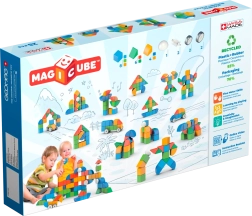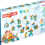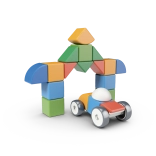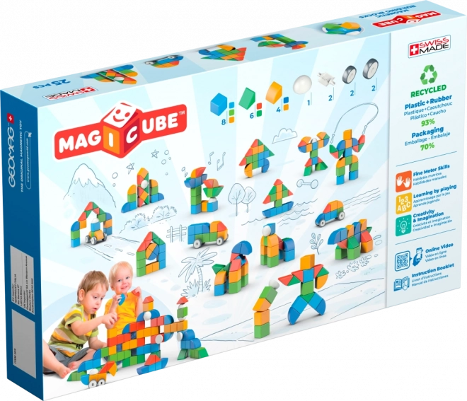 A GEOMAG MAGICUBE SHAPES okos szórakozást kínál 1 éves kortól mágneses kockákkal és formákkal, amelyek könnyen és biztonságosan kapcsolódnak egymáshoz. A készlet 25 elemet tartalmaz, köztük kerekeket is, így a kis építők nemcsak tornyokat és házikókat, hanem egyszerű járműveket és mozgó modelleket is készíthetnek. A színes kivitel támogatja a színek és formák felismerését, a finommotorikát és a térbeli képzelőerőt.