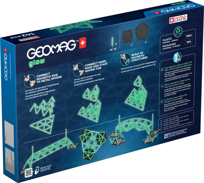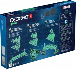Fedezd fel a mágneses konstrukciók kreatív világát a Geomag Glow készlettel, amely sötétben ragyog, és ösztönzi a gyerekek és felnőttek fantáziáját. A világító pálcák és acélgolyók kombinációjával egyszerű és összetett 2D és 3D modelleket alkothatsz, amelyek stabilak a masszív talpaknak köszönhetően.