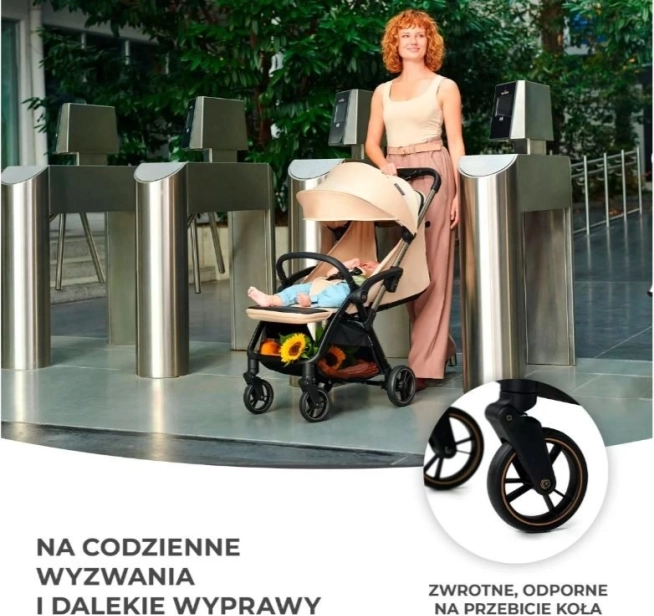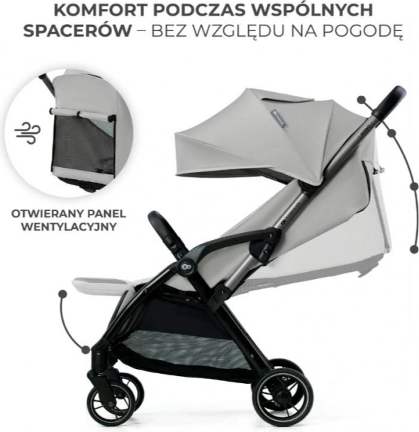 A gyermek számára 4 fokozatú háttámla-állítást kínál ülő helyzettől a fekvőig, állítható lábtartót, puha 5 pontos biztonsági övet vállpárnákkal, valamint nagy kupolát szellőzőpanellel és betekintő ablakkal a folyamatos kapcsolathoz. A defektmentes kerekek első 360°-os bolygózással megkönnyítik a manőverezést városban és útközben.