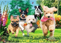 Játékos kutyák a virágzó kertben – energia, érzelmek és részletgazdag illusztráció, amely kezdőknek és tapasztalt kirakózóknak egyaránt örömet szerez.