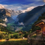 Élethű fotó hegycsúcsokkal, zöld völggyel és faházzal – öröm minden utazás- és természetkedvelőnek.