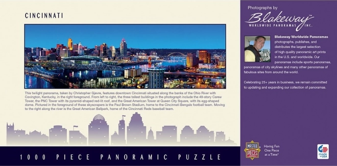 Fedezze fel az amerikai nagyváros szépségét a MASTERPIECES „Cincinnati, Ohio” 1000 darabos panoráma puzzle-lel. A Cityscapes sorozat ragyogó színeket, precíz kivitelezést és masszív kirakódarabokat kínál, amelyek tökéletesen illeszkednek egymáshoz. Újrahasznosított és újrahasznosítható anyagból készült.