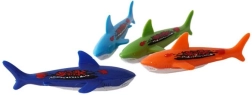 4 színes cápa, amelyek a vízbe dobva lesüllyednek, és neked kell őket kihalásznod.