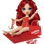 Ruby Red készen áll egy szórakoztató napra a barátaival a piros fürdőruhájában, összeillő szandálokkal, napszemüveggel és táskával. Kiváló szórakozás a medence mellett, a kádban vagy bárhol, ahol a képzeleted engedi.