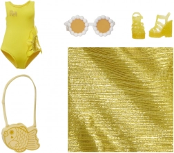 Divatos kiegészítőkkel, mint például fürdőruha, napszemüveg és hal alakú kézitáska.