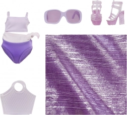 A kiegészítők közé tartozik a lila öltözék, napszemüveg, cipők és egy kis kézitáska, amely különböző divatos variációkat és témákat tesz lehetővé, mint a strand vagy a nyár.