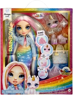 A Rainbow High Amaya baba a divatos megjelenést végtelen játéklehetőséggel ötvözi. A hosszú, szivárványszínű haj hívogat fésülésre és stylingra, a csillogó ruha és a farmerdzseki minden polcon ragyog, a csuklós kivitel pedig dinamikus pózokat tesz lehetővé – a kifutós beállításoktól egészen a spárgáig.