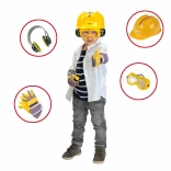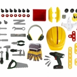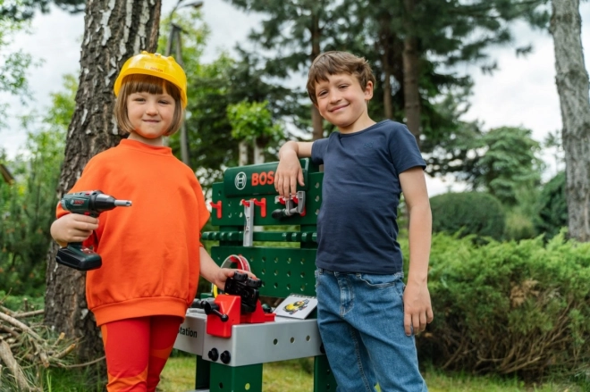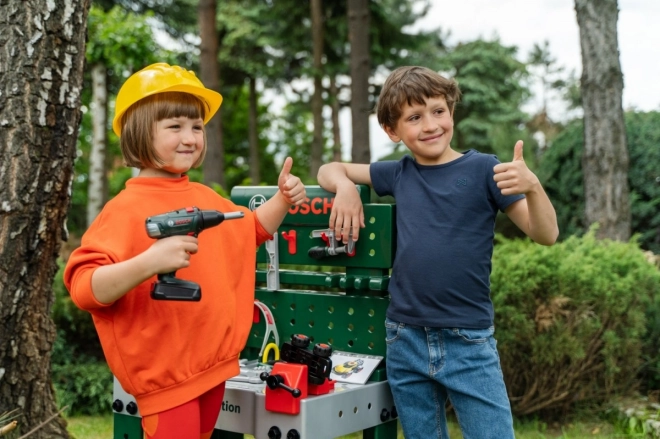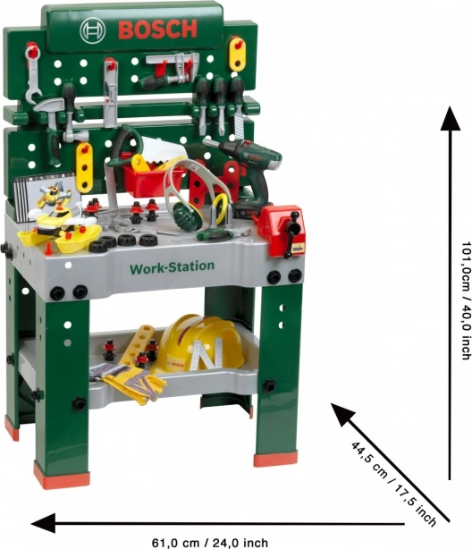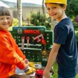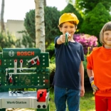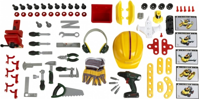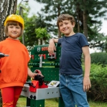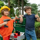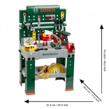 A teljesen felszerelt gyerek munkapad Németországban készül Bosch licenc alatt. Az asztallap számos valósághű funkciót, satuját, praktikus tárolókat és rakodórekeszt kínál. A barkácsasztal hátsó falán és a munkalap alatti polcon hely van a minőségi, 81 darabból álló tartozéknak, amelyek közül néhány a praktikus akasztókkal a falra függeszthető: gyerek akkumulátoros csavarhúzó, lapos és keresztfejű csavarhúzó, villáskulcs, franciakulcs, fogó és reszelő, kalapács, fűrész és mérőszalag, derékszög, vonalzó és csavaros szorító. A gyerekek megtanulnak ügyesen bánni különböző méretű és formájú csavarokkal, anyákkal és csavarozható elemekkel, valamint odafigyelni a biztonságra a játék védősisakoknak és védőszemüvegeknek, a fülvédőknek és a kesztyűknek köszönhetően. Különösen szórakoztató az önszerelő jármű, amelyet a munkaállomáson lehet forgatni és újra összerakni. Így a gyerekszoba műhellyé válik! Elég felvenni a sisakot és a védőszemüveget, felhúzni a kesztyűt, és már kezdődhet a fűrészelés, kalapálás és csavarozás. A szorgos kis tervezők munkáját satu segíti, amely megtartja a léceket a szegekkel vagy csavarokkal való rögzítéshez. Rendelkezésre áll egy akkumulátoros csavarhúzó is, amely fénnyel és hanggal mindent meghúz, amiből a kicsik valami nagyot szeretnének összeállítani, és ha kész a munka, mindent gyorsan fel lehet akasztani a kampókra és elrendezni a dobozokban.