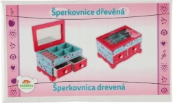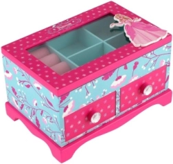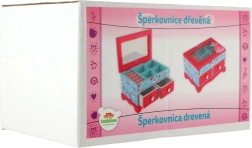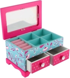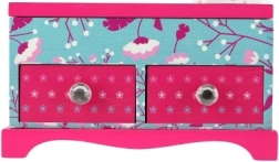 Elegáns, minőségi fából készült gyerek ékszerdoboz felnyitható fedéllel és két fiókkal, ideális ékszerek és apró kincsek tárolására. Kiemelkedik színes, vidám dizájnjával, virág- és madármintával rózsaszín–kék összeállításban, valamint hercegnős motívummal díszítve. A praktikus belső elrendezés és a beépített tükör megkönnyíti a mindennapi használatot a gyerekszobában.