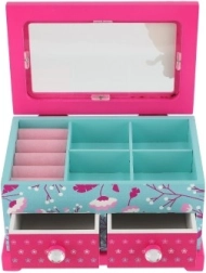 Az ékszerdobozt finom virág- és madármotívumok díszítik rózsaszín és türkizkék színkombinációban, amelyek szépen illenek bármely gyerekszobába. A masszív fa kivitelnek és a sima fogantyúknak köszönhetően a gyerekek számára is kényelmes a használata. Nem játék – dekorációs és tárolási célra alkalmas.