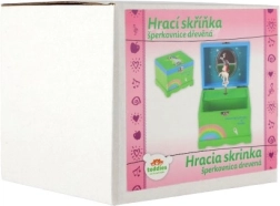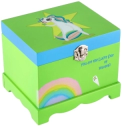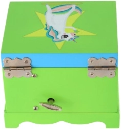 Ez a zenélő ékszerdoboz biztonságos és áttekinthető helyet kínál a gyerekek kincseinek. A beépített tükörrel ellátott fedél felnyitása után, a kulcs felhúzását követően a fehér–rózsaszín egyszarvú forogni kezd, és felcsendül a dallam, amely minden nyitáskor mosolyt csal az arcokra.