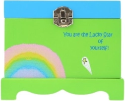 A tartós faszerkezet fém zárral és bájos egyszarvú- és szivárványmotívummal bármely gyerekszobába illik. Kompakt méreteinek köszönhetően polcra vagy komódra helyezhető, miközben elegendő helyet kínál gyűrűknek, fülbevalóknak és apró szuveníreknek.