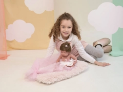 A ruhácskák organikus pamutból, gyapjúból és újrahasznosított anyagokból készülnek, így fenntartható választás is. A baba mozgatni tudja a karjait, a lábait és a fejét, ami támogatja a finommotorikát és a kreatív játékot. A csomagban mindent megtalál, ami az ölelgetéshez és a kiállításhoz szükséges.