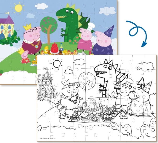 Ez a kétoldalas puzzle dupla élményt nyújt a gyerekeknek. Először kirakhatják a vidám képet a kedvelt Peppa malac szereplőkkel, majd a másik, fekete-fehér oldalt a befejezés után saját fantáziájuk szerint kiszínezhetik. Az összeállított kép mérete körülbelül 32 × 23 cm, így kényelmesen elfér a gyerekszobai asztalon.