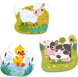 A készlet három önálló, körvonalas kirakót tartalmaz tanyasi állatok motívumaival, mindegyik eltérő darabszámmal (2, 3 és 4). A fokozatos nehézség ideálissá teszi az első kirakózásokhoz, erősíti a koncentrációt, és örömet szerez a siker élményével.