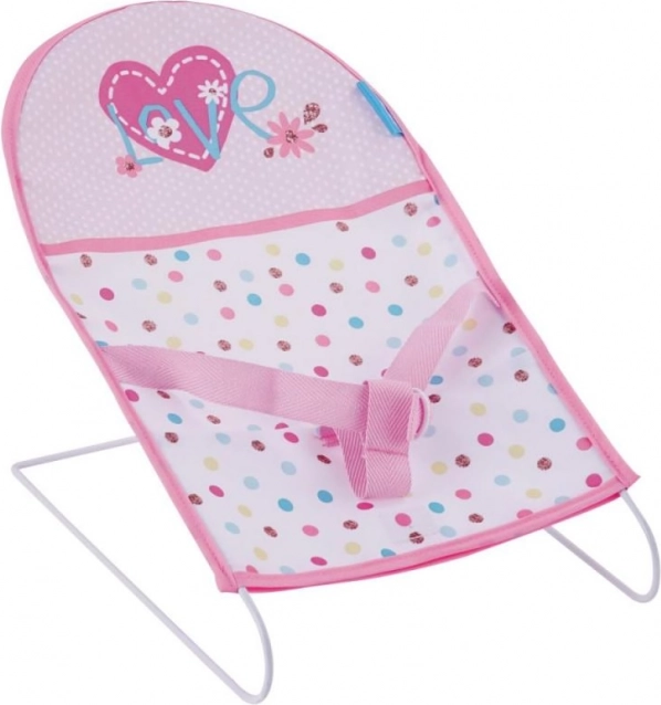 A hintaszék fémkerettel kényelmes ülőhelyet biztosít a játszó babának. Biztonsági övvel és szív- és virágmintával van ellátva.